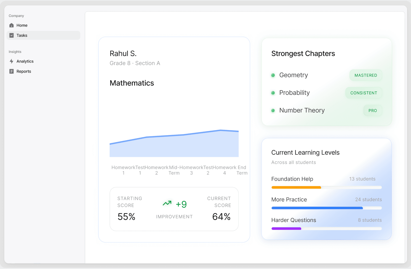 Highlight what concepts a student has mastered and where help is needed, so feedback feels specific and useful.
