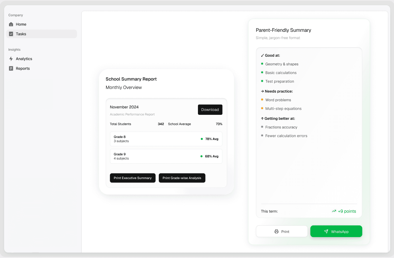 Generate structured, shareable reports that schools can confidently communicate with parents.