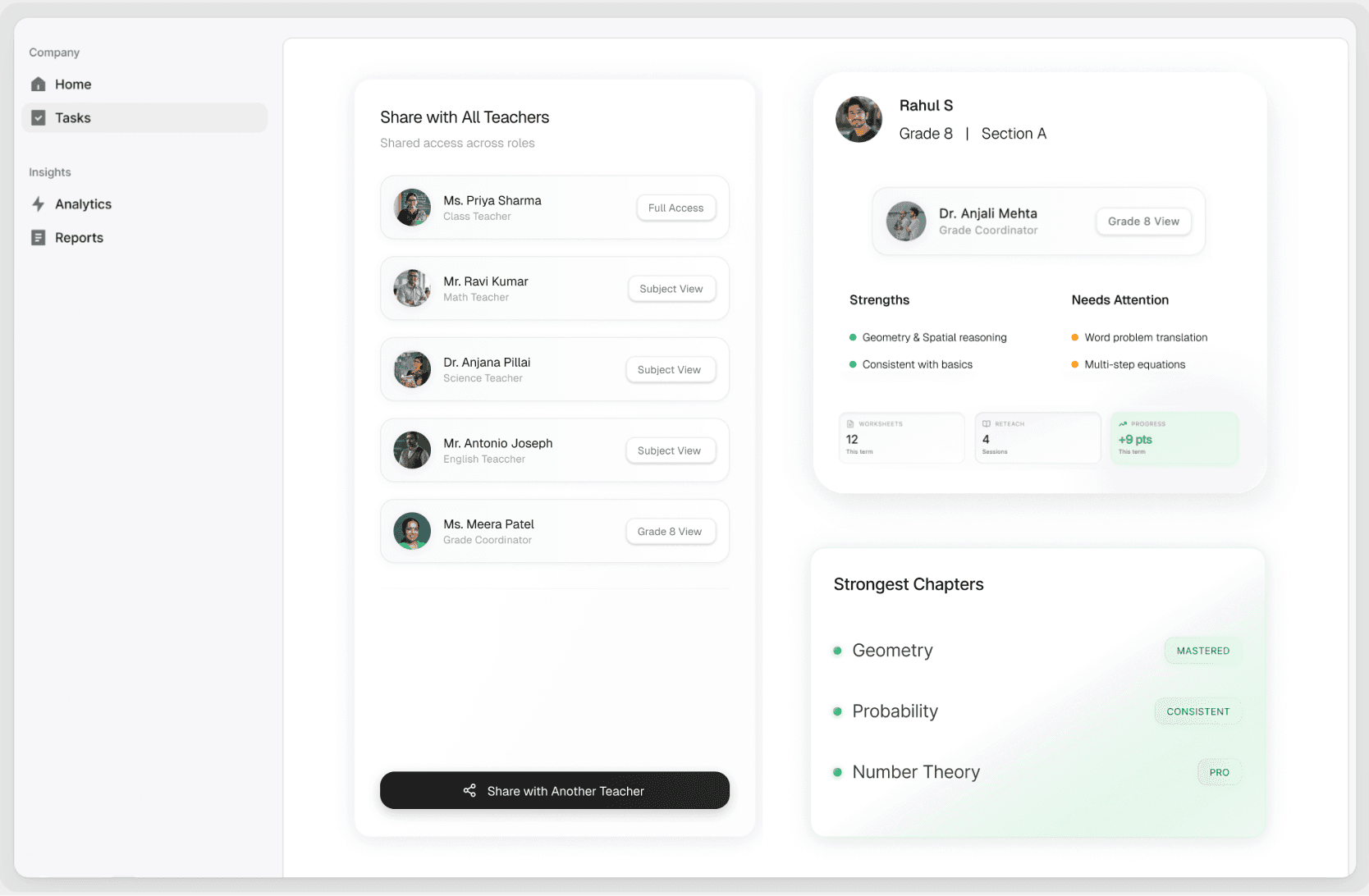 Leadership gets clear summaries, and the school retains student history across years and batches, even when teachers change.