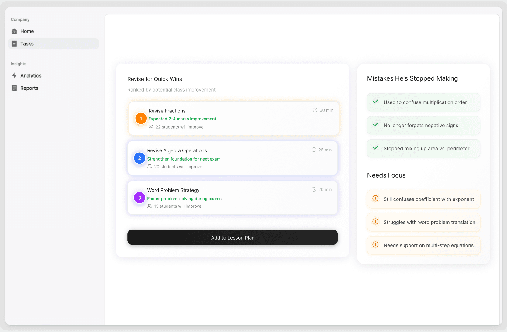Clear guidance to reteach weak concepts without starting from scratch.